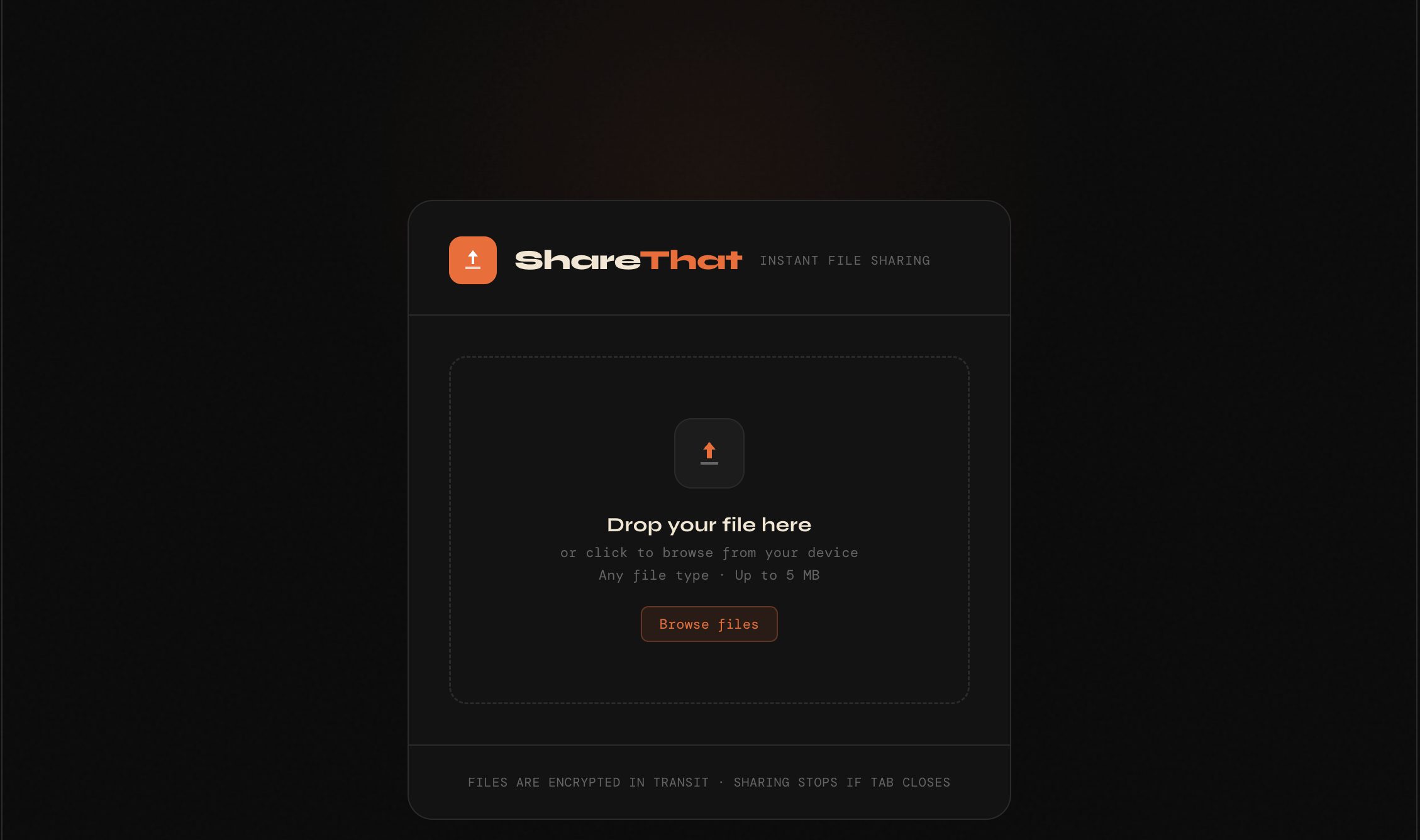 ShareThat is a peer-to-peer file sharing app built with WebRTC and WebSockets, enabling direct browser-to-browser file transfers without storing data on a server. It uses a lightweight Go backend for signaling and React on the frontend to establish secure, real-time connections and stream files efficiently.